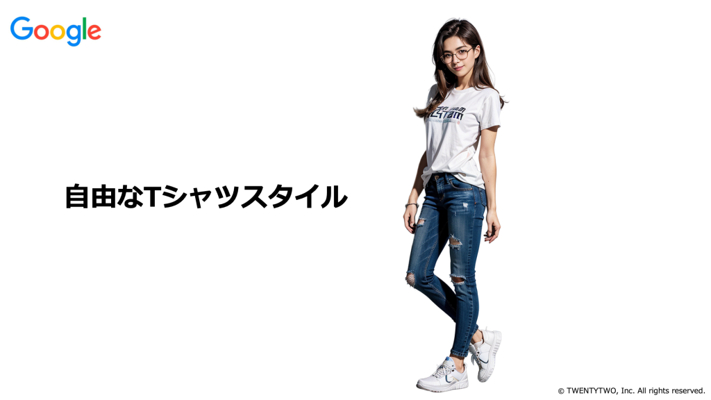 会社ロゴ風のTシャツをラフに着こなしており、ドレスコードのない自由なカルチャーを体現しています。形式よりも中身や成果を重視する社風です。