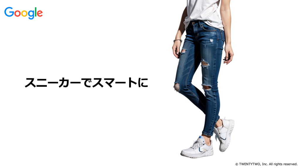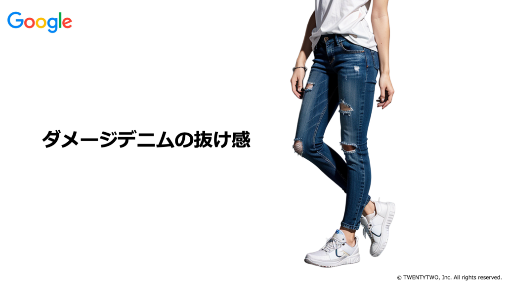 破れ加工のデニムを自然に履きこなしており、個性やクリエイティブさを尊重する環境を反映しています。細かい規則に縛られない姿勢です。