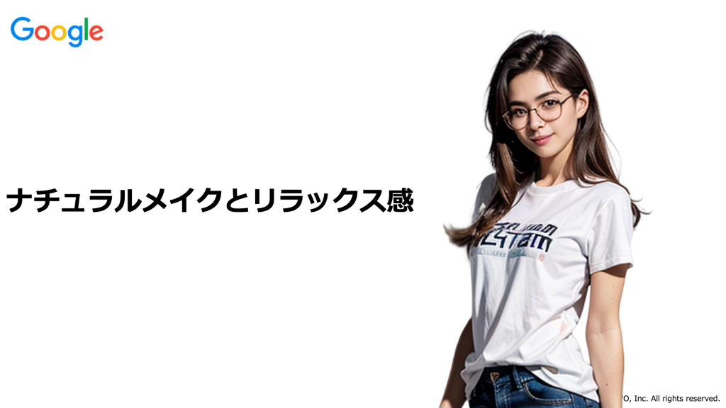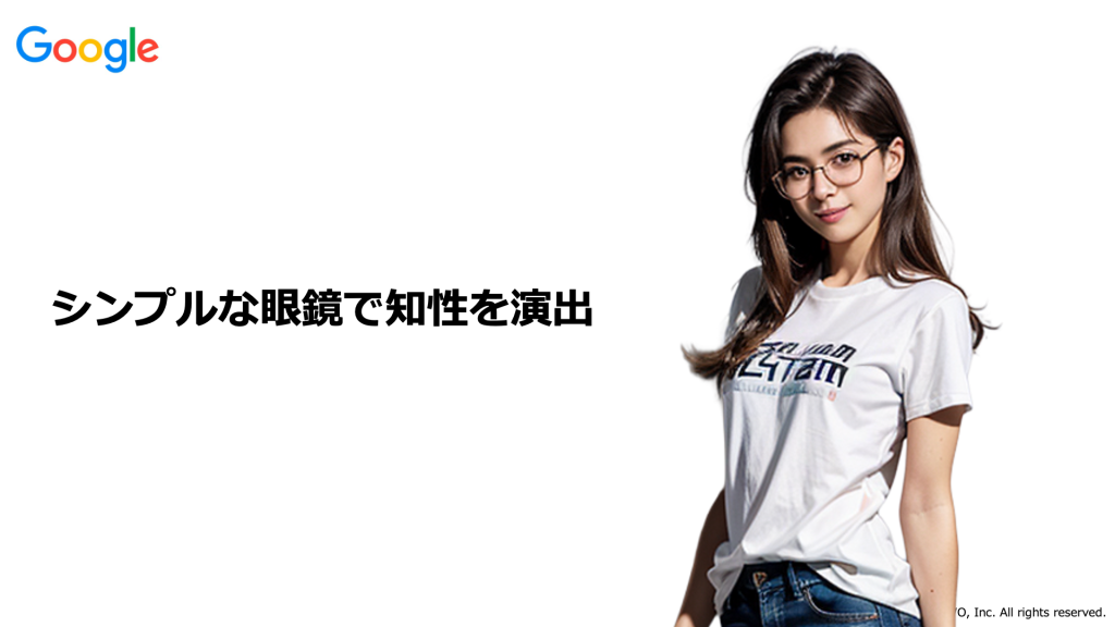 クリアなデザインの眼鏡を身につけ、理知的で論理的な雰囲気を感じさせます。議論やデータを重んじるグーグル社員らしい知的印象です。