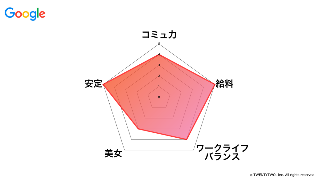 グーグルは世界的に影響力のある企業ですが、外資系企業であるため成果主義や組織再編による人員調整のリスクも存在します。日本企業のような終身雇用の文化はなく、業績や戦略によって部署の縮小が行われることもあります。そのため安定性は中間の3点としました。