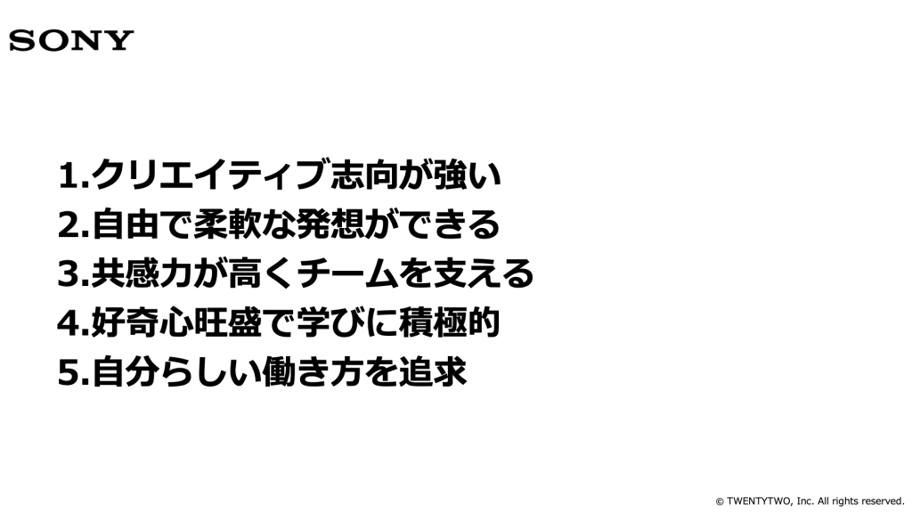 穏やかさの中に芯のある眼差しです。グローバル企業として挑戦を続けるソニー社員の、自立したプロ意識を感じさせます。