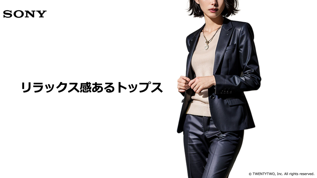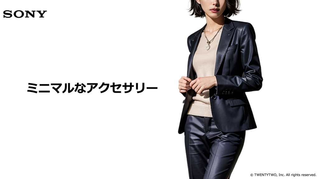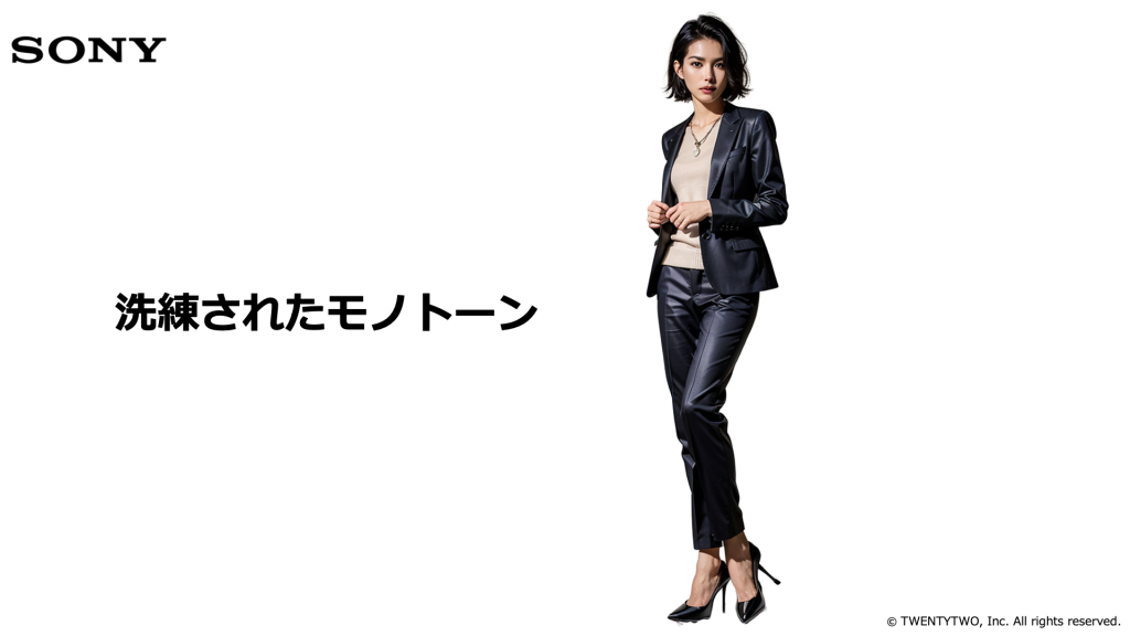 黒のセットアップにベージュのトップスを合わせたシンプルかつ洗練された配色です。無駄のないデザイン性は、ソニーのプロダクト精神にも通じます。