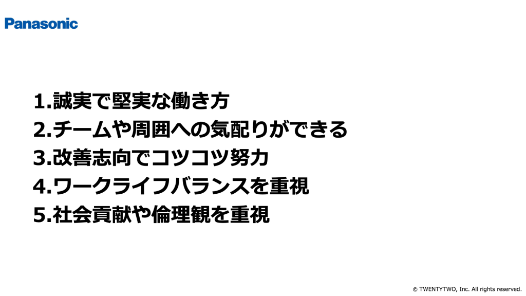 パナソニックは歴史ある大企業で、礼儀や協調性を重んじる社風があります。上司や他部署との連携は求められますが、派手な自己主張よりも、丁寧で落ち着いたコミュニケーションが好まれます。積極的で社交的というより、穏やかな会話が中心なため、平均的な3点としました。