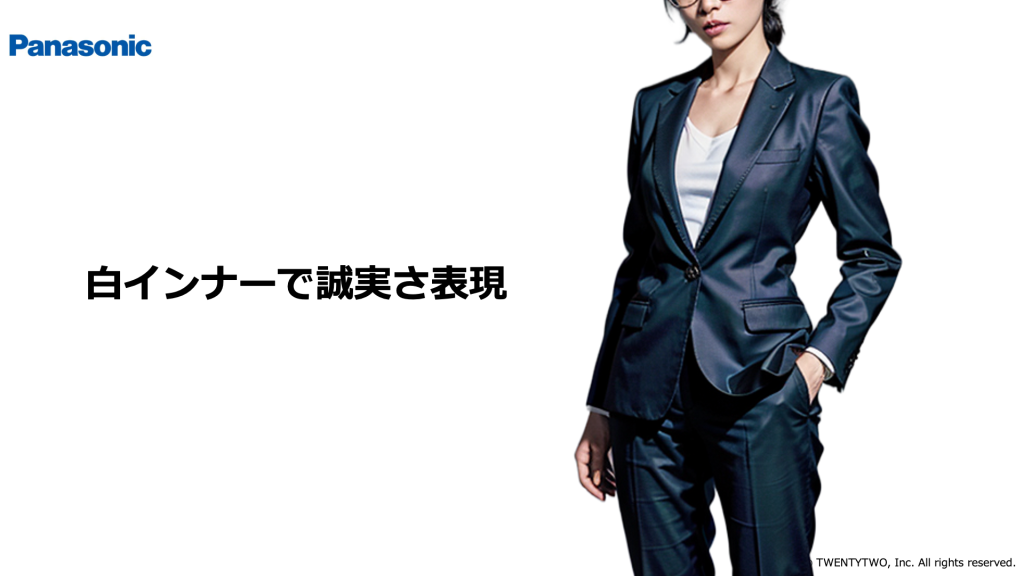 落ち着いた濃紺スーツは、歴史ある企業らしい信頼感や誠実さを象徴しています。派手さよりも安心感と調和を大切にする姿勢です。