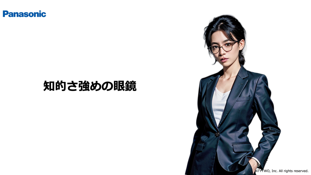眼鏡をかけたスタイルは、技術と論理性を重視するパナソニックらしい知性を感じさせます。現場目線と専門性の両立を象徴しています。