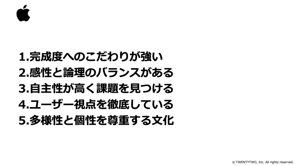 Apple Japanの女性社員は、仕事の細部まで丁寧に仕上げる姿勢を持っています。製品やサービスの完成度を徹底的に追求し、「美しさ」「使いやすさ」「一貫性」への意識が高いです。妥協せず、質にこだわる責任感が強い点が特徴です。