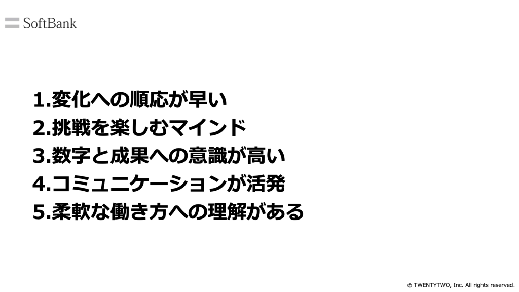 ソフトバンクの女性社員は、通信からIT・投資まで多角的に事業展開する環境で働くため、変化や新しい挑戦への対応力が高いです。状況が変わっても柔軟に対応し、スピード感のある意思決定や行動が求められる中で成長していく姿勢が特徴です。