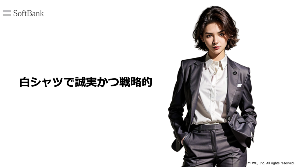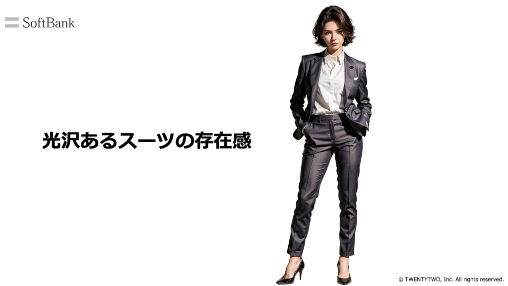 艶のあるスーツは、攻めの姿勢とビジネスへの本気度を表しています。投資・通信・テックなど多領域で挑戦するソフトバンクらしい迫力です。