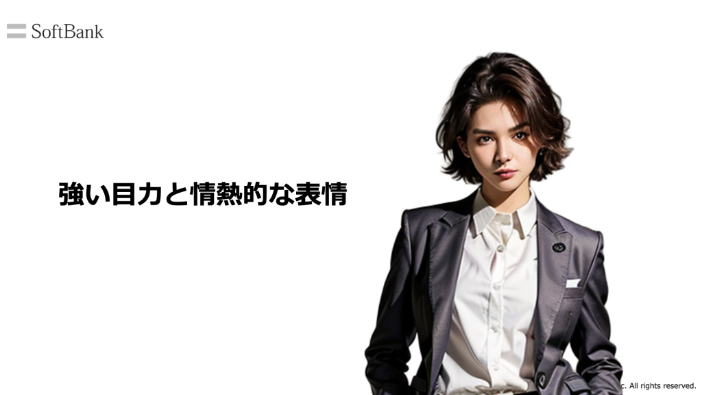 まっすぐな視線は、リスクを恐れず挑戦を続けるソフトバンクの精神を映しています。感情と信念を持って働く印象です。