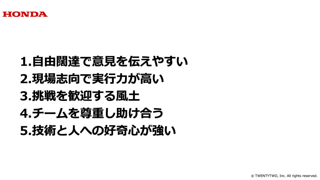 ホンダは現場を大切にする文化が強く、女性社員も机上の理論だけでなく、実際に試して改善する実行力を持っています。行動して学び、改善を繰り返す姿勢が求められるため、フットワークの軽さと粘り強さが身に付いています。