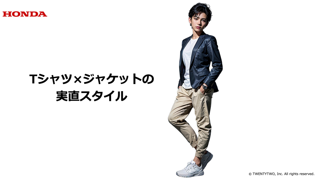 白Tシャツにジャケットという飾らない服装は、肩書きよりも「やってみよう」の精神を大切にするホンダの自由な社風に合っています。