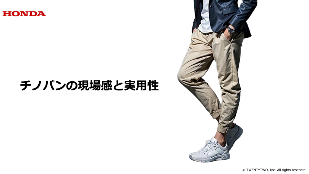 ベージュのチノパンは、工場・開発・営業など現場に強いホンダらしさを表しています。動きやすさと実行力を重視した装いです。