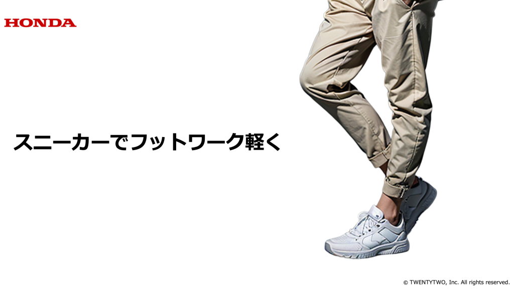 機動力を感じる白スニーカーは、新しい挑戦や現場移動が多い、ホンダらしいスピード感と行動力を象徴しています。