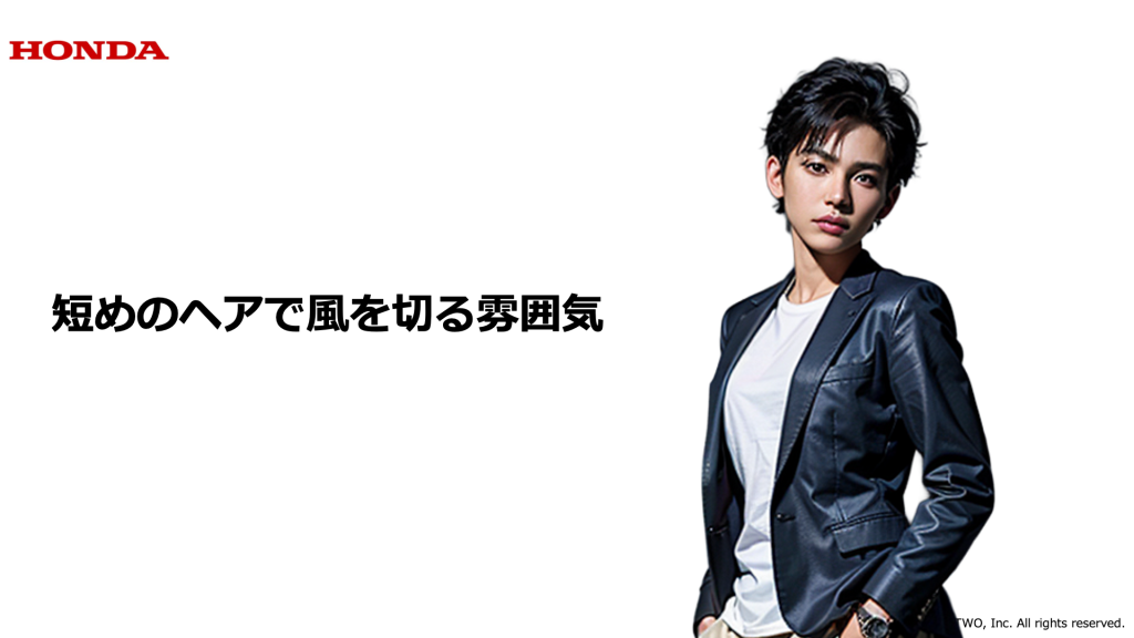 ショートヘアは、風やスピードを感じさせるスポーティな印象です。二輪・四輪メーカーとしての技術愛や自由さを連想させます。