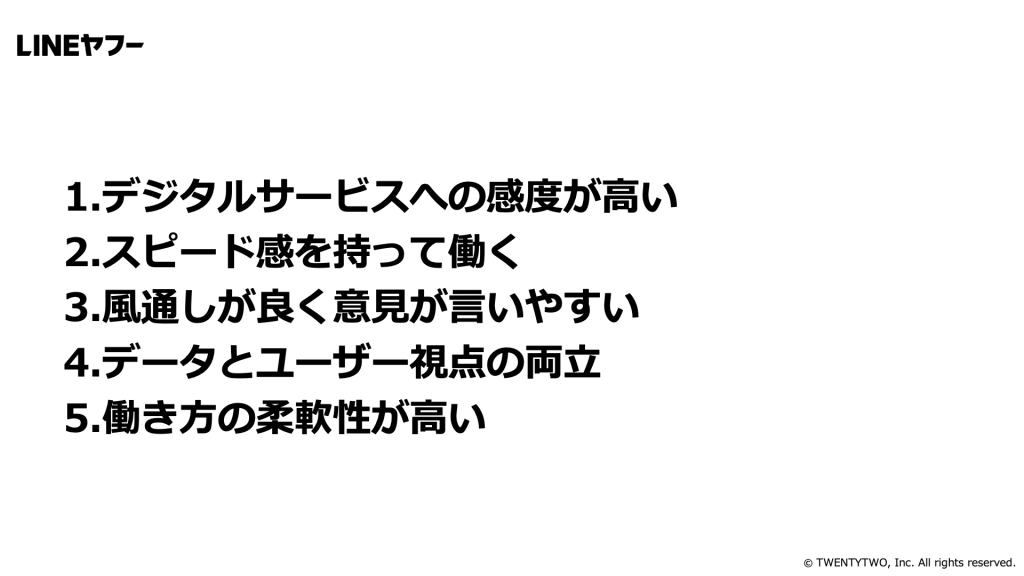 LINEヤフーの女性社員は、日常的に多くのユーザーと接するサービスに関わるため、トレンドや生活者の行動変化に敏感です。データやユーザーの声をもとにサービス改善を考える力が高く、生活者視点での発想が強みです。