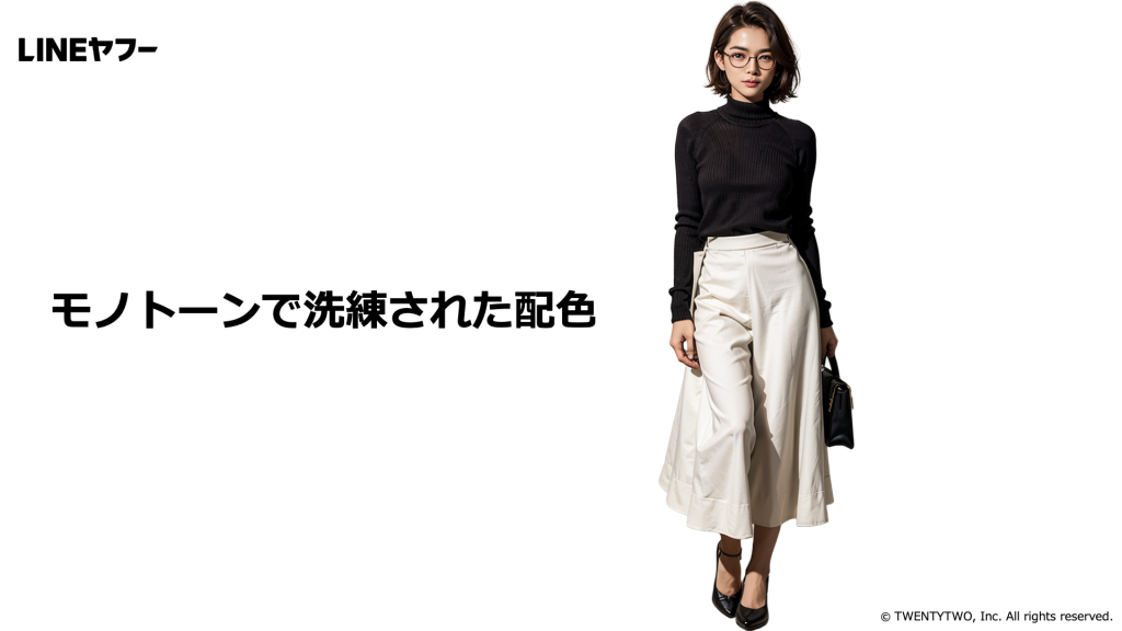 黒トップスと白のワイドパンツというシンプルな配色は、デジタル企業らしい無駄のないデザイン思考を象徴しています。