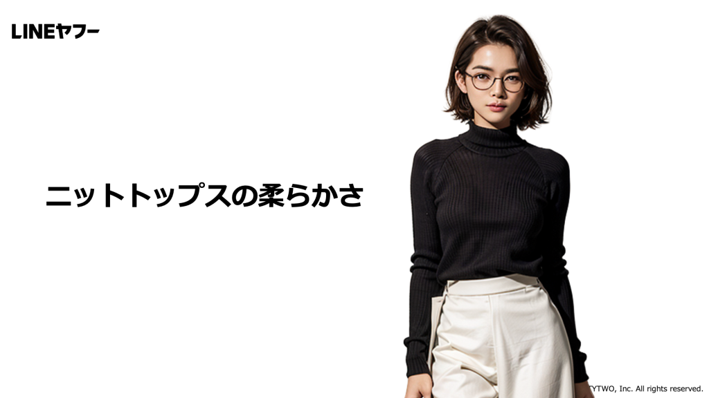 かっちりしすぎない黒ニットは、服装自由な社風とリモートワーク文化の柔軟さを表しています。ユーザーに寄り添う温かさも感じられます。