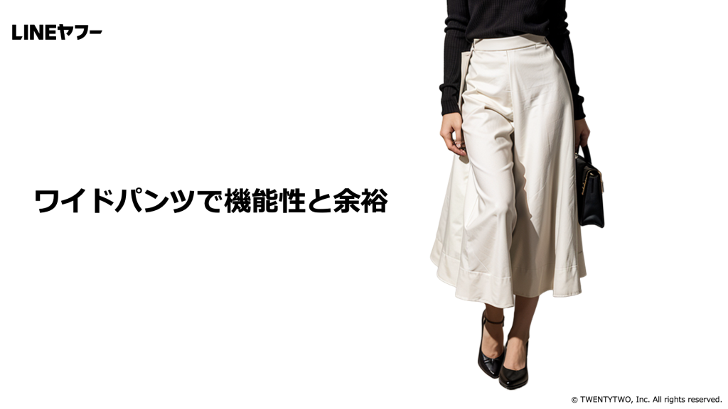 動きやすさと品の良さを両立したワイドシルエットは、多様な働き方やスピードある開発現場に適応したスタイルです。