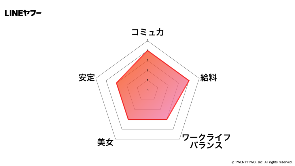 「コミュ力」「給料」「ワークライフバランス」「美女」「安定」の 5つの項目を、それぞれ 5点満点で採点しました。