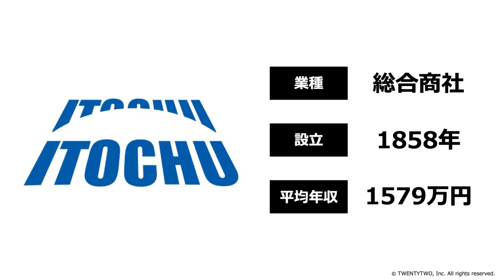 伊藤忠商事は、三菱商事、三井物産、住友商事、丸紅と共に五大商社の一つ。傘下にファミリーマートなど。生活消費関連ビジネスなどの非資源分野で高い収益率を有する。政府系企業に出資するなど、中国との結びつきも強いです。