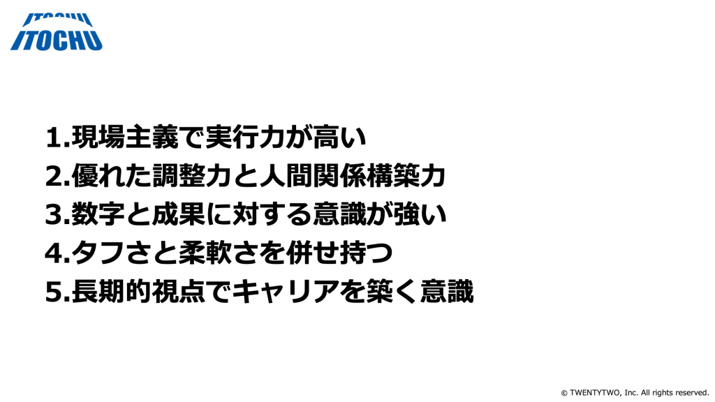 柔らかい表情は、商社の中でも特に人間関係を大切にする伊藤忠らしい“人情の厚さ”を感じさせます。チームや取引先との信頼感を重視する姿勢です。