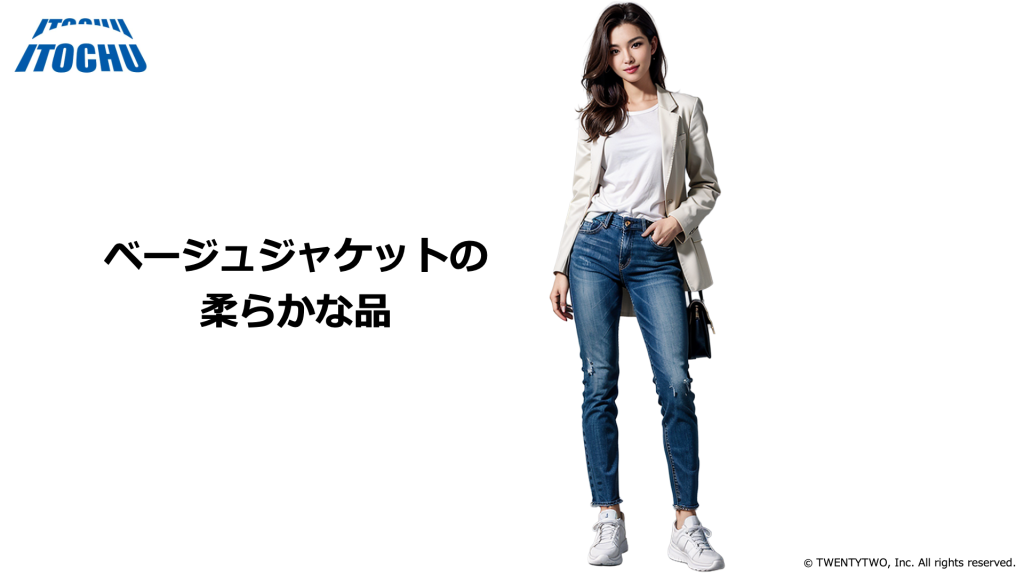 淡い色のジャケットは、親しみやすさと上品さを両立しています。人との信頼関係を重視する伊藤忠らしい温かみがあります。