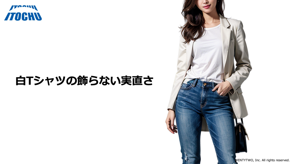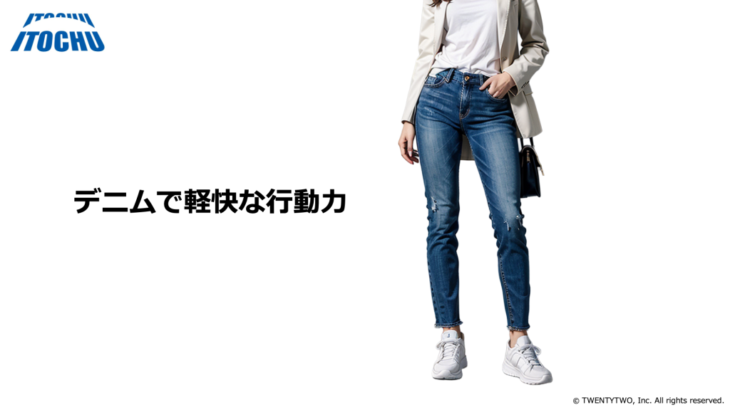 デニムパンツは、現場へ動き回る実践型の働き方を象徴しています。机上よりも「まずやってみる」伊藤忠精神が反映されています。