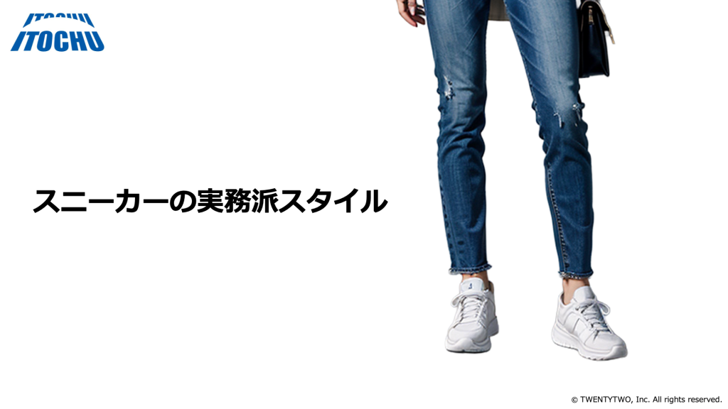 白スニーカーは、忙しい移動や長時間勤務にも対応できる実用性重視の選択です。早朝から動く「朝型商社」の雰囲気にも合います。