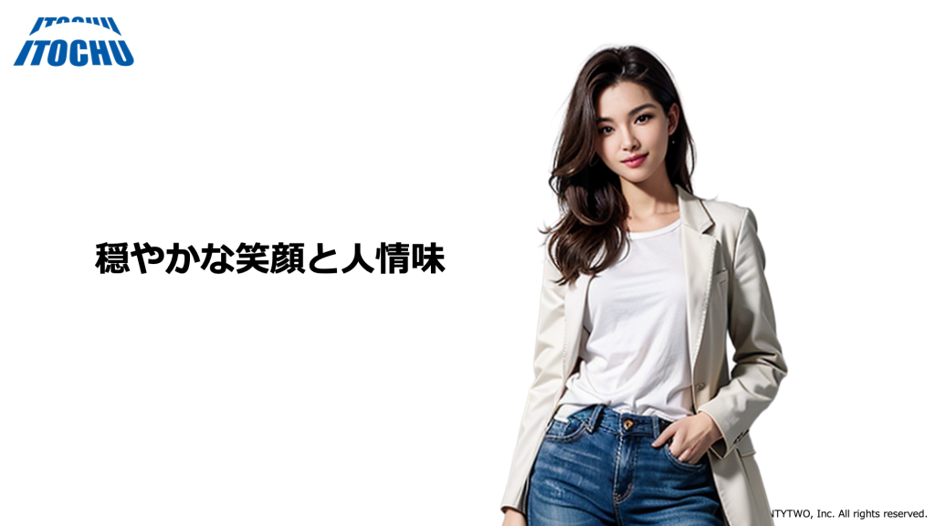 「伊藤忠商事」の女性社員を擬人化した場合、どのような外見になるでしょうか?