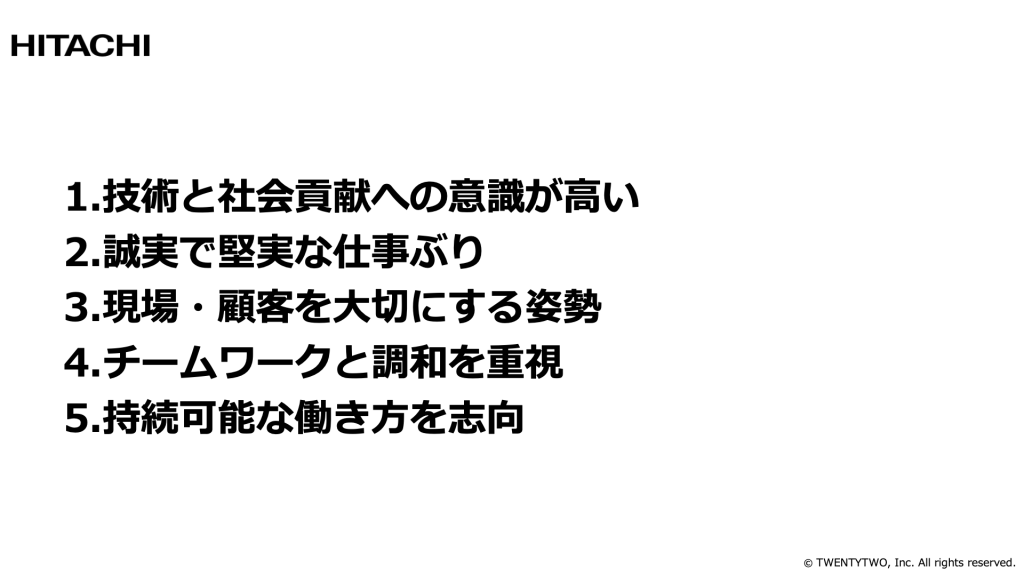 日立製作所の女性社員は、「社会に役立つ技術をつくる」という企業理念に共感し、社会課題の解決に貢献したいという意識を持って働いています。利益だけでなく公共性や持続可能性を意識しながら、使命感を持って業務に取り組む姿勢が特徴です。