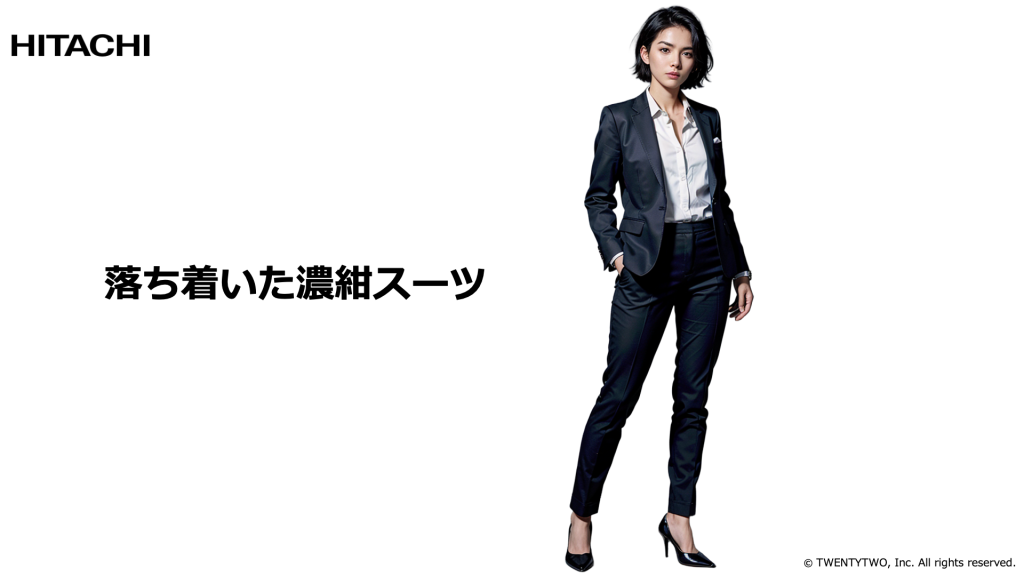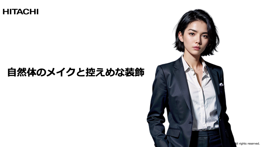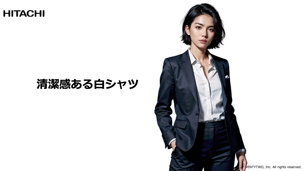 白シャツをきちんと着こなしており、誠実さと基本を大切にする日立の姿勢が現れています。装飾よりも信頼感を優先するスタイルです。