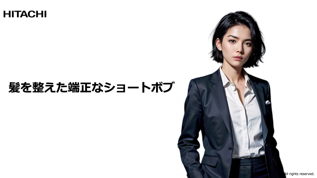 「日立製作所」の女性社員を擬人化した場合、どのような外見になるでしょうか?