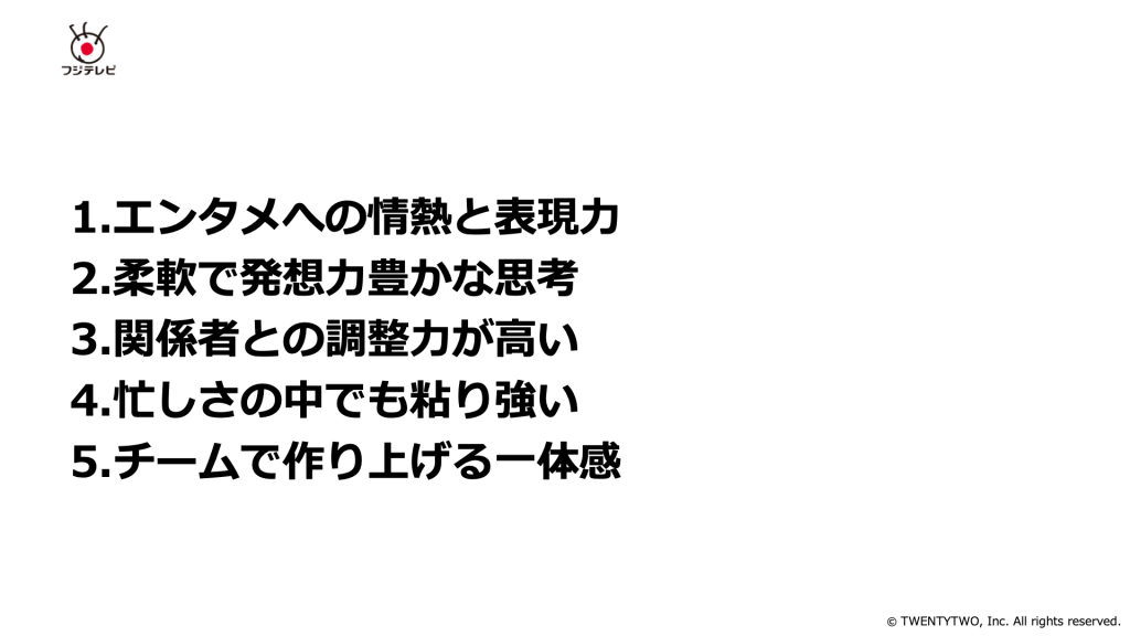 番組やメディアの企画では常に新しい視点やアイデアが求められます。女性社員も固定概念にとらわれず、自由な発想を持って企画を考える力があり、話題性や面白さを追求する柔軟な思考が身についています。