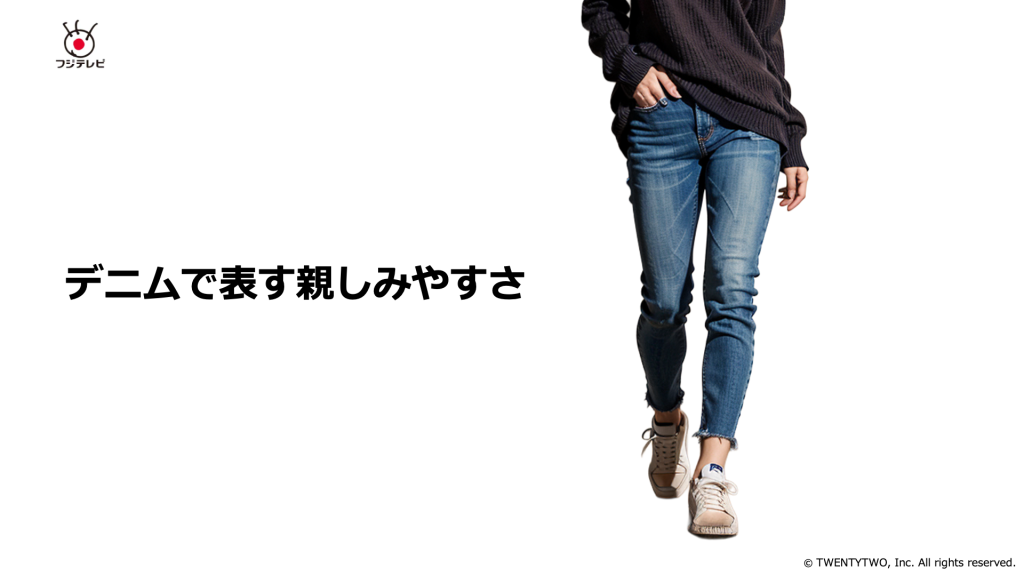 カジュアルなデニムパンツは、視聴者との距離感が近いフジテレビらしい明るさと親しみやすさを感じさせます。