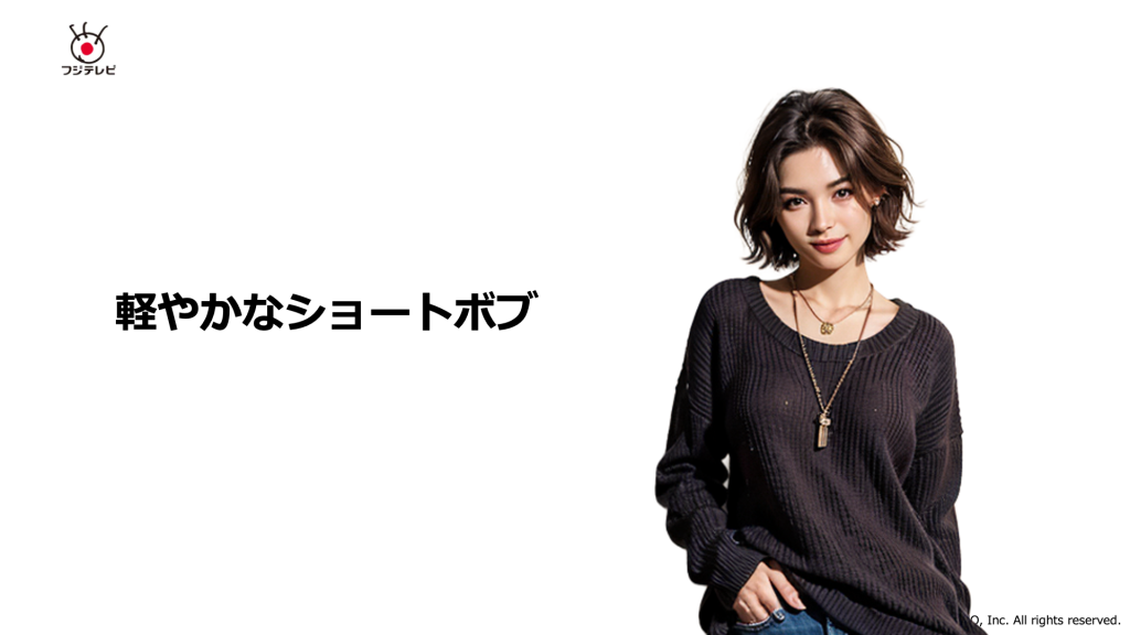 トレンドを押さえたラフなショートボブは、流行に敏感でスタイルの更新を怠らないテレビマン気質を反映しています。