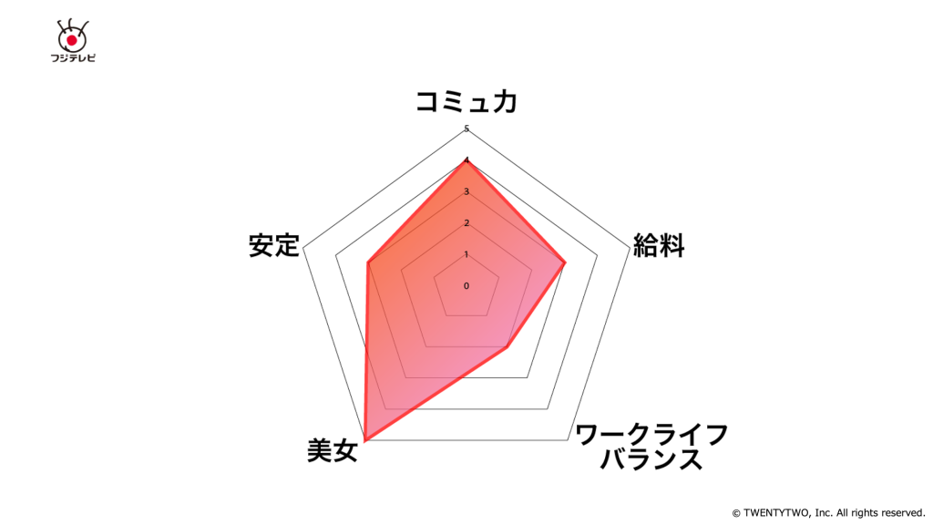 出演者や社外パートナーと接する機会が多く、画面に映る職種も多いことから、見た目への意識が高い社員が多いです。洗練されたメイクやトレンドを意識したファッションが多く、華やかな美人が目立つため、美女は最高評価の5点としました。