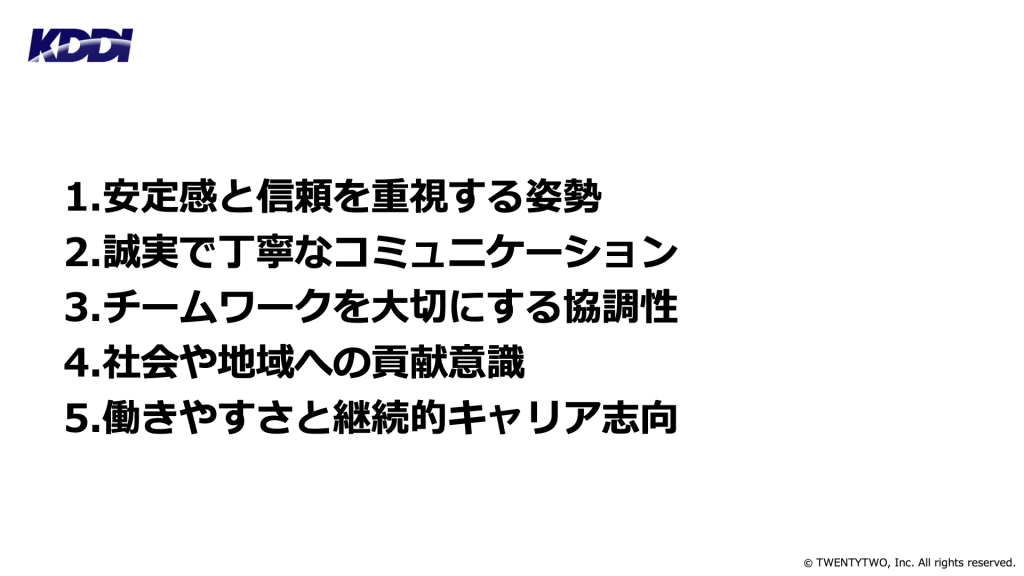 KDDIの女性社員は、通信インフラを支える企業としての責任を意識しながら、安定した品質と信頼される仕事を重視します。慎重かつ丁寧に物事を進める姿勢が特徴で、長期的視点での成果を大切にしています。