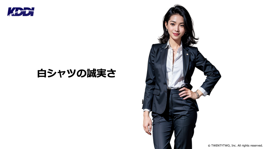 清潔感のある白シャツは、顧客やパートナーと真摯に向き合う姿勢を表しています。シンプルながら信頼を感じさせる装いです。