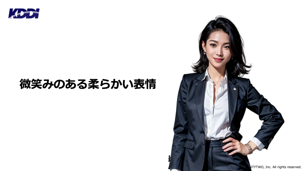 穏やかな笑顔は、ドコモより親しみやすく、ソフトバンクより落ち着いたKDDIらしい「温度感のあるコミュニケーション力」を感じさせます。