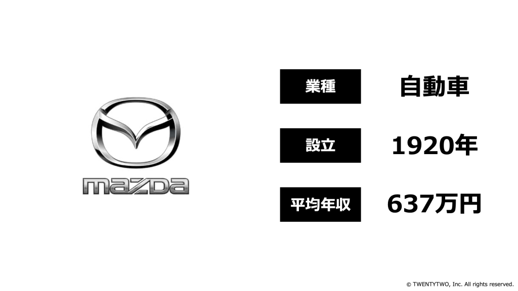 マツダは、大手自動車メーカー。「SKYACTIV技術」を用いた低燃費で動力性能高いエンジンが強みで、「ロードスター」等の人気ブランドを有しています。国内生産に占める輸出比率が約8割と、自動車メーカーで最も高いです。