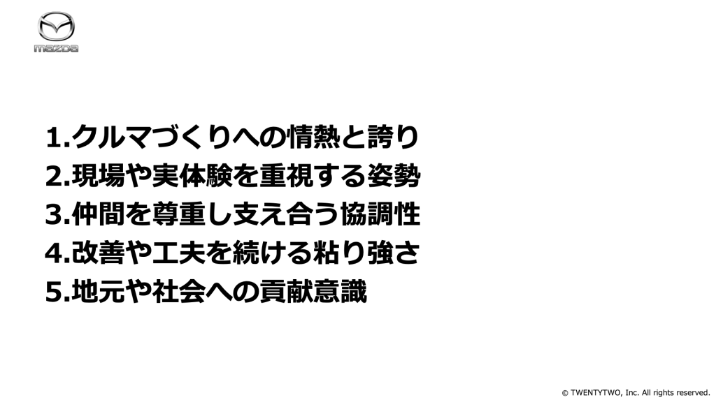 マツダは「現地・現物・現実」を大切にする文化が強く、女性社員も実際の現場やユーザーの声を最重視します。机上の議論よりも自分の目で確かめ、体感しながら判断・改善を進める実践型のスタンスを持っています。