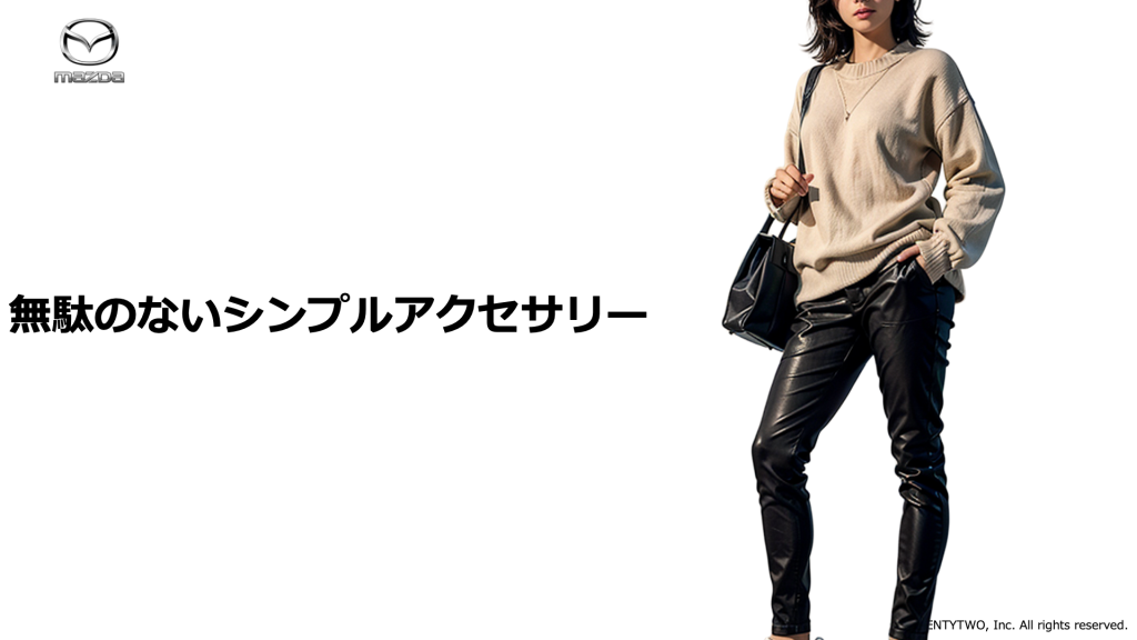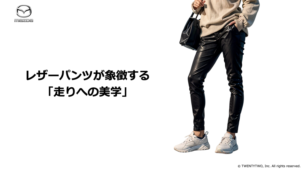 黒のレザーパンツは、“走る歓び”を追求するマツダのスポーティで感性工学的な思想を感じさせます。機能とデザインの両立を体現しています。