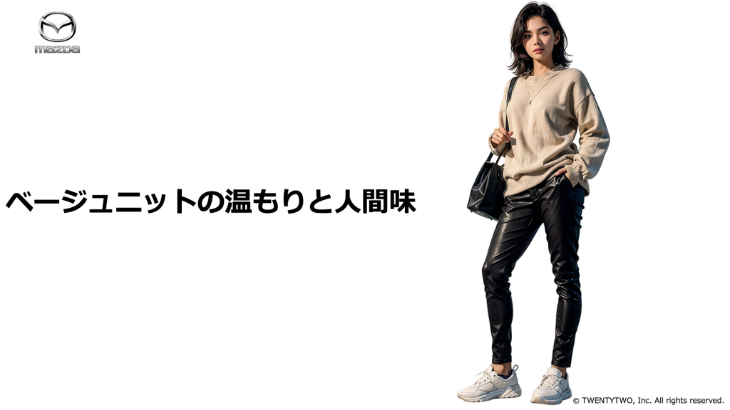 柔らかな色味のニットは、マツダの“人馬一体”“人中心のモノづくり”と通じる温かみを表現しています。トヨタほど堅くなく、ホンダより落ち着いた柔らかさです。