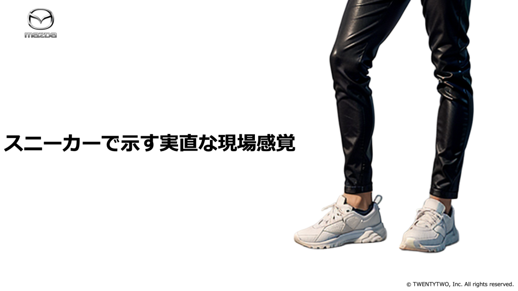 白スニーカーは、現場目線で動く姿勢やフットワークの軽さを象徴。会議室よりも工場や開発現場との距離が近いマツダらしさがあります。