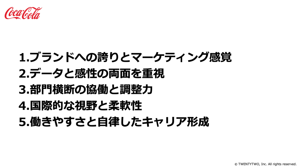 日本コカ・コーラの女性社員は、世界的ブランドに携わる誇りを持ち、消費者の心を掴むマーケティングやブランド戦略に強い関心を持っています。商品の価値や体験をどう届けるかを意識しながら働く姿勢が特徴です。