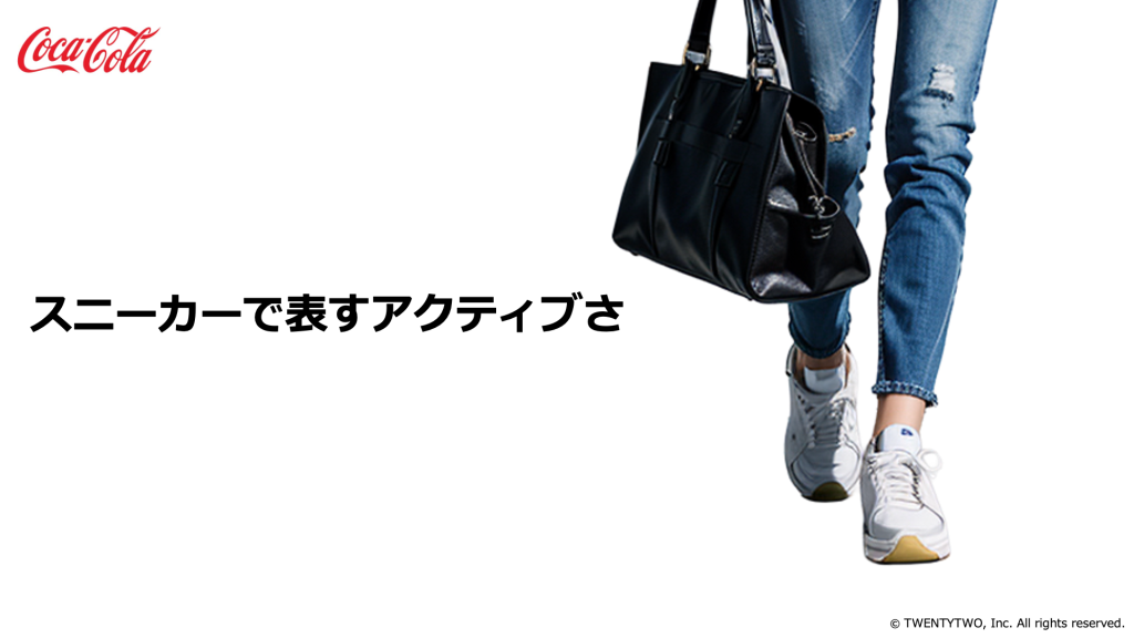 白スニーカーは、イベント・店舗・プロモーション現場にもすぐ足を運べるフットワークの軽さをイメージさせます。企画から実行まで走り回るイメージです。