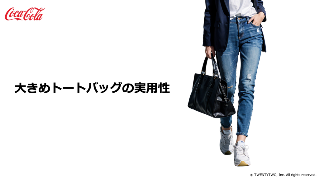 資料・PC・サンプル飲料などを持ち歩くマーケティング職らしく、大きめバッグを使っている点に現場志向の実務感があります。
