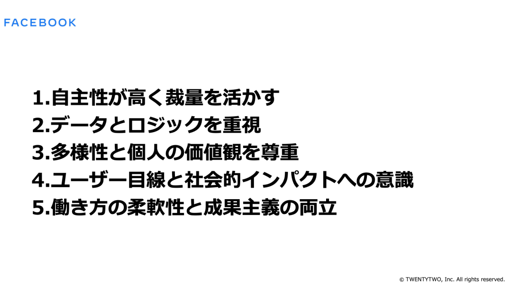 Facebook Japanの女性社員は、自分で課題を見つけ、解決方法を考え、主体的に動く姿勢が求められます。ルールより成果に重きが置かれ、自らの判断で仕事を進める裁量が大きいため、高い自主性と責任感を持って働く姿勢が特徴です。