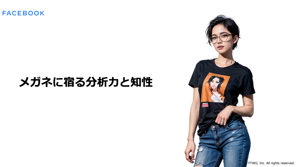 シンプルな眼鏡は、データやロジックを重視するMetaらしい「分析・テクノロジー・戦略思考」のイメージを表現しています。
