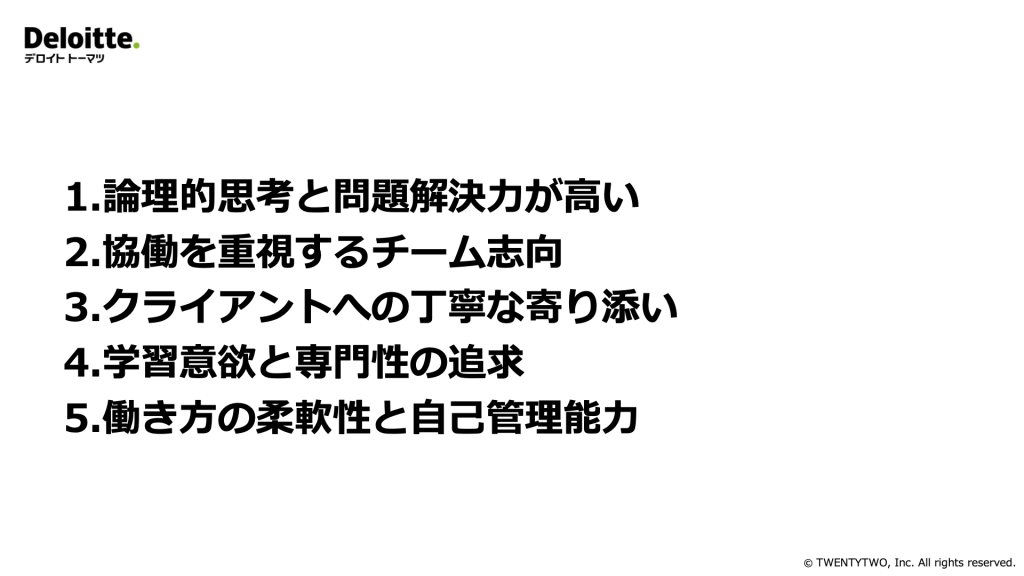 柔らかい笑みは、コンサルの中でも“尖りすぎず、人との協働や関係構築を大切にする”デロイトの雰囲気をよく表しています。